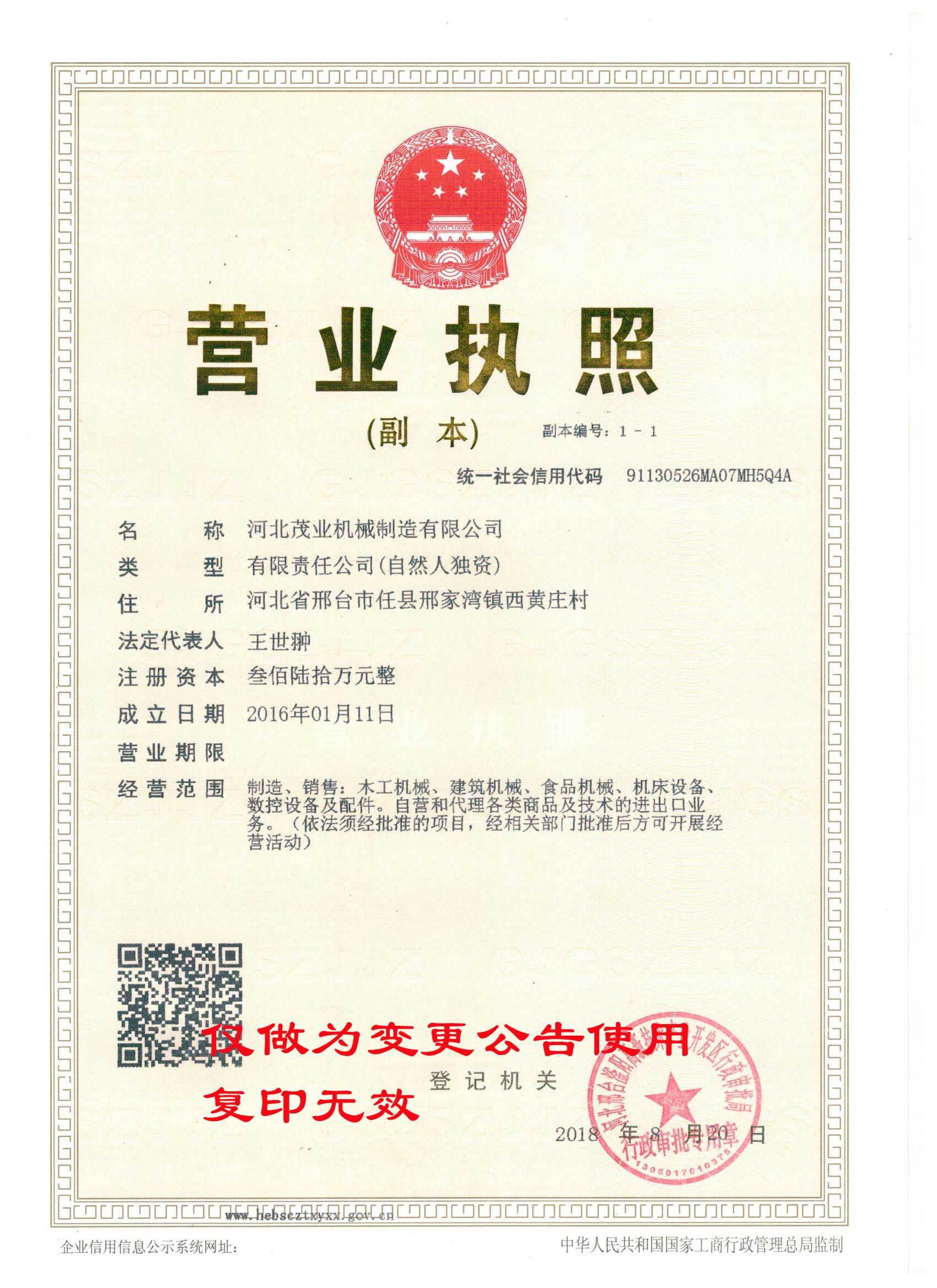 我司邢臺茂業(yè)機械制造有限公司,因公司業(yè)務發(fā)展的需要,現(xiàn)已整體變更為河北茂業(yè)機械制造有限公司,并于2018年8月20日取得河北邢臺滏陽高新技術產業(yè)開發(fā)區(qū)審批局頒發(fā)的營業(yè)執(zhí)照。現(xiàn)將有關事項公告如下:
